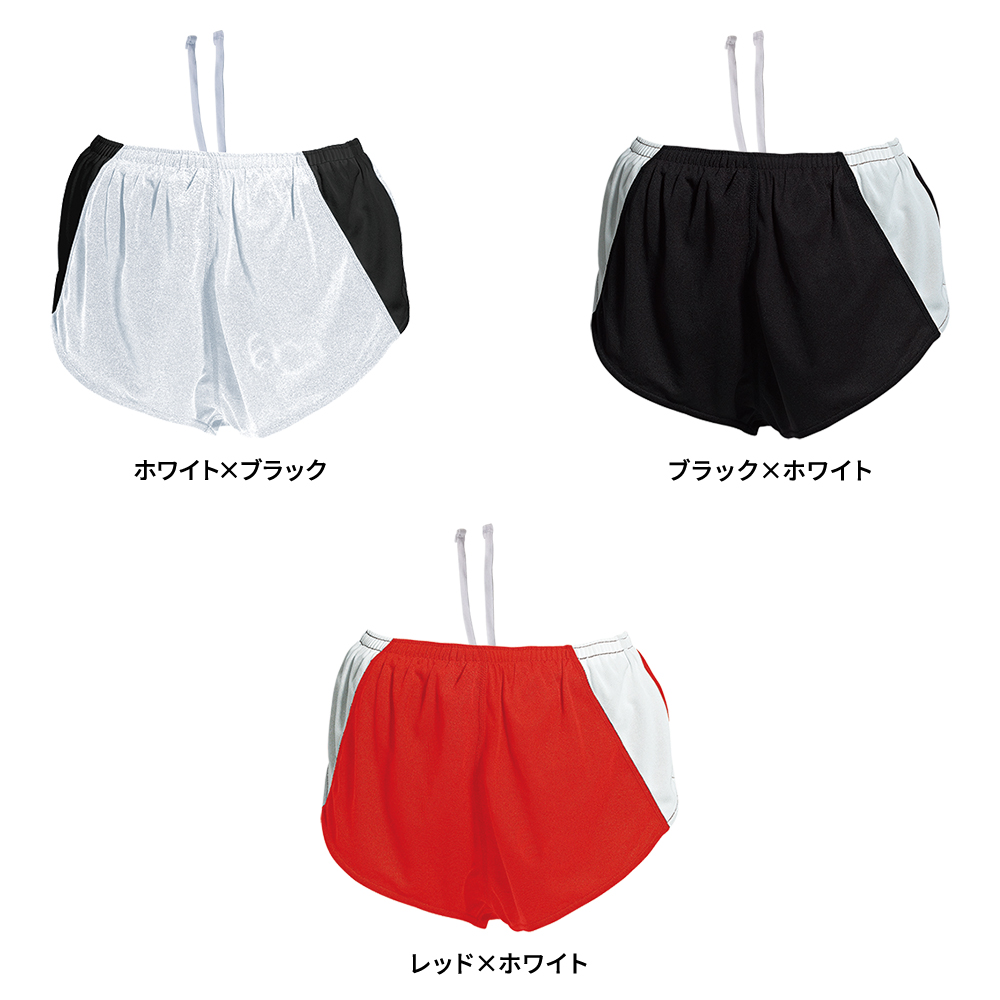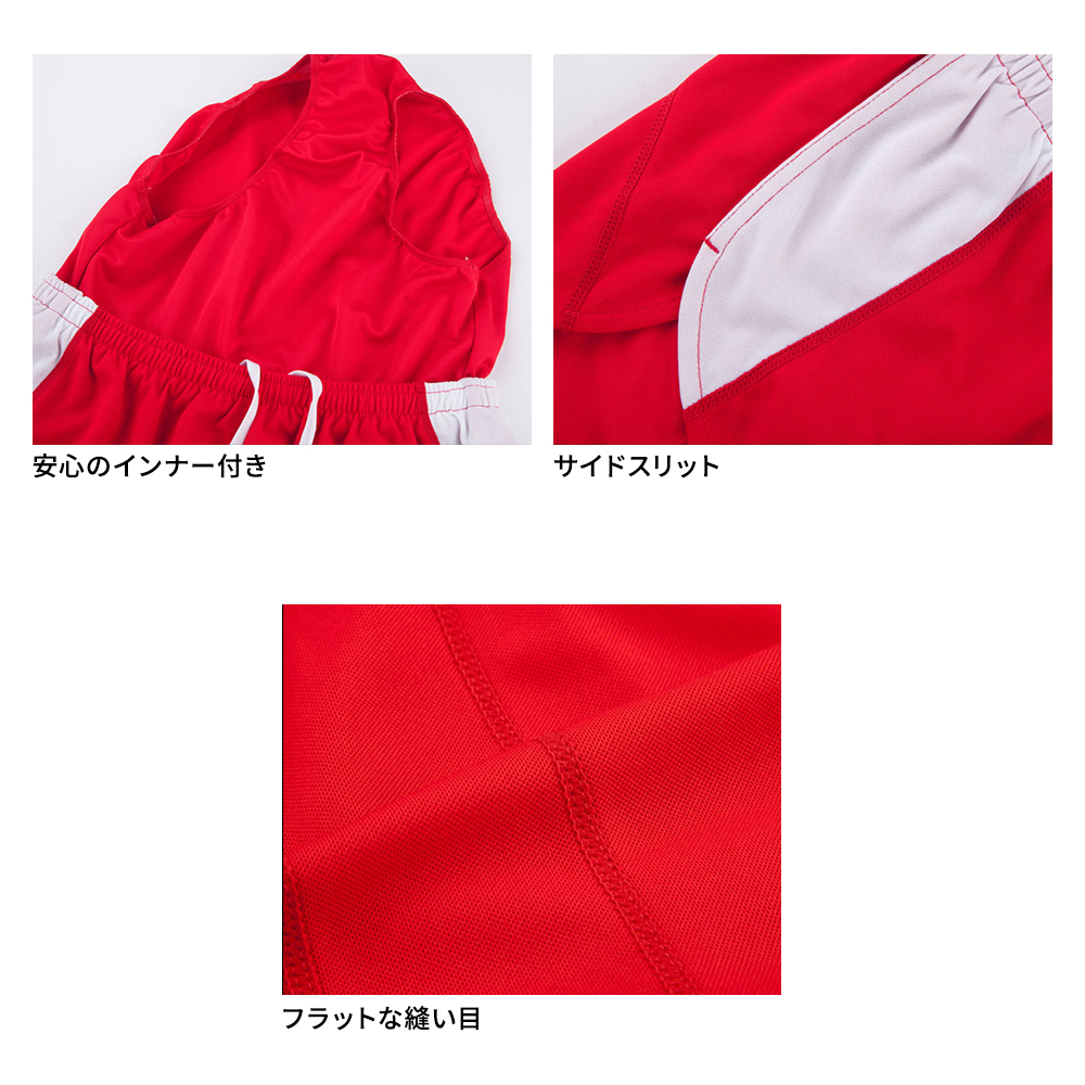 メッシュ素材のインナー付きで通気性がよくなっています。裾口はゴム付きでフィット感があり、安心の履き心地。切り替え部分の縫製はフラットシーマ(4本針)で肌の摩擦を軽減しています。陸上のウェアとしてはもちろん、企業でもお使いいただいています。