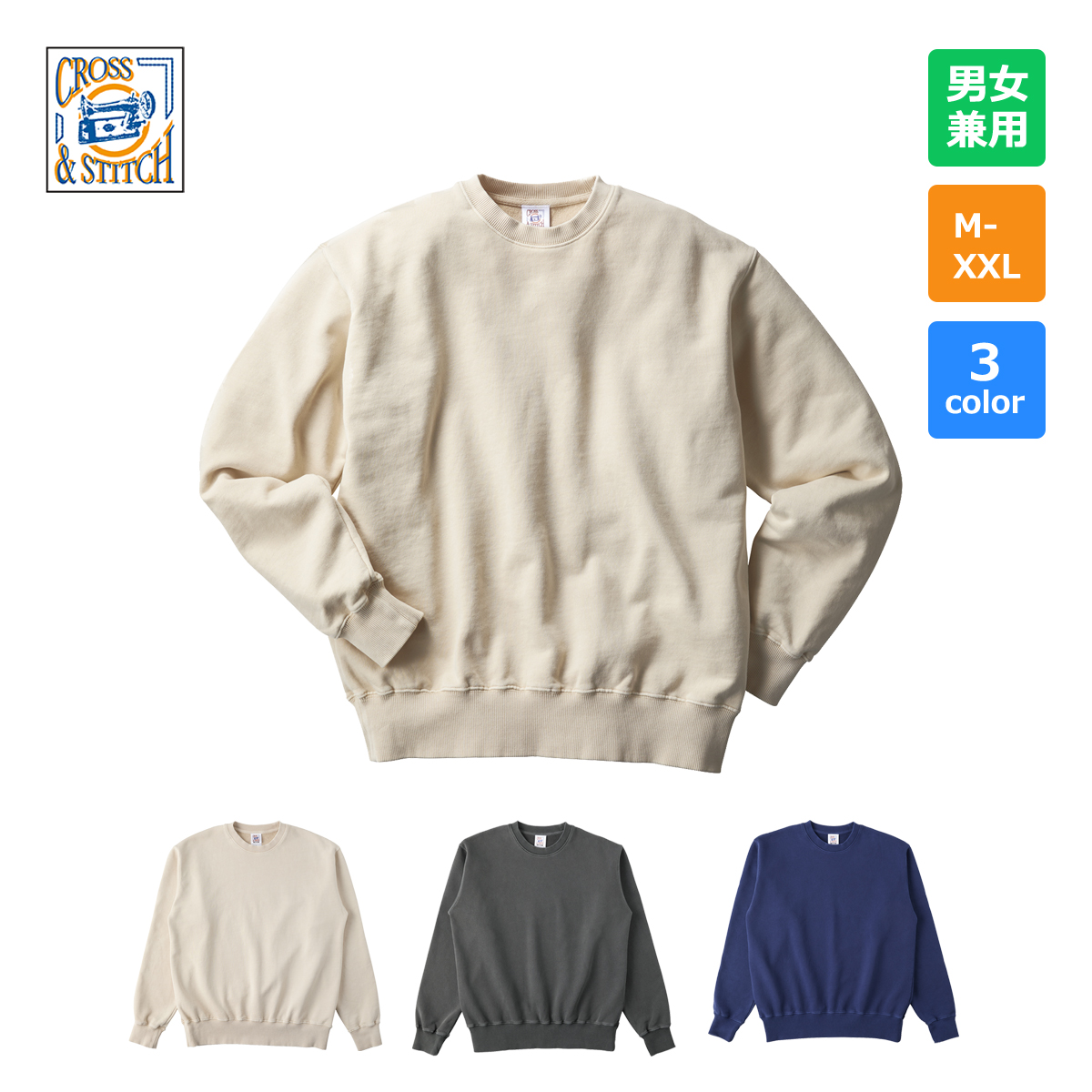 顔料染めによるヴィンテージ感のある色合いがたまらない、ピグメントスウェットシャツ。繊維の中に空気を多く含み、吸湿性・速乾性に優れたオープンエンド糸を使用しているので、シャリ感のある肌ざわりに。カラーは合わせやすい3色展開です。