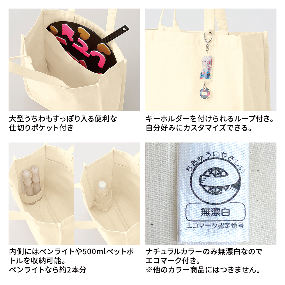 A3サイズのものが収まる大きなサイズで、荷物もたっぷり入り、中には大きめうちわも入る仕切りポケットやペンライトや500mlペットボトルを収納できる仕切りも付いています。