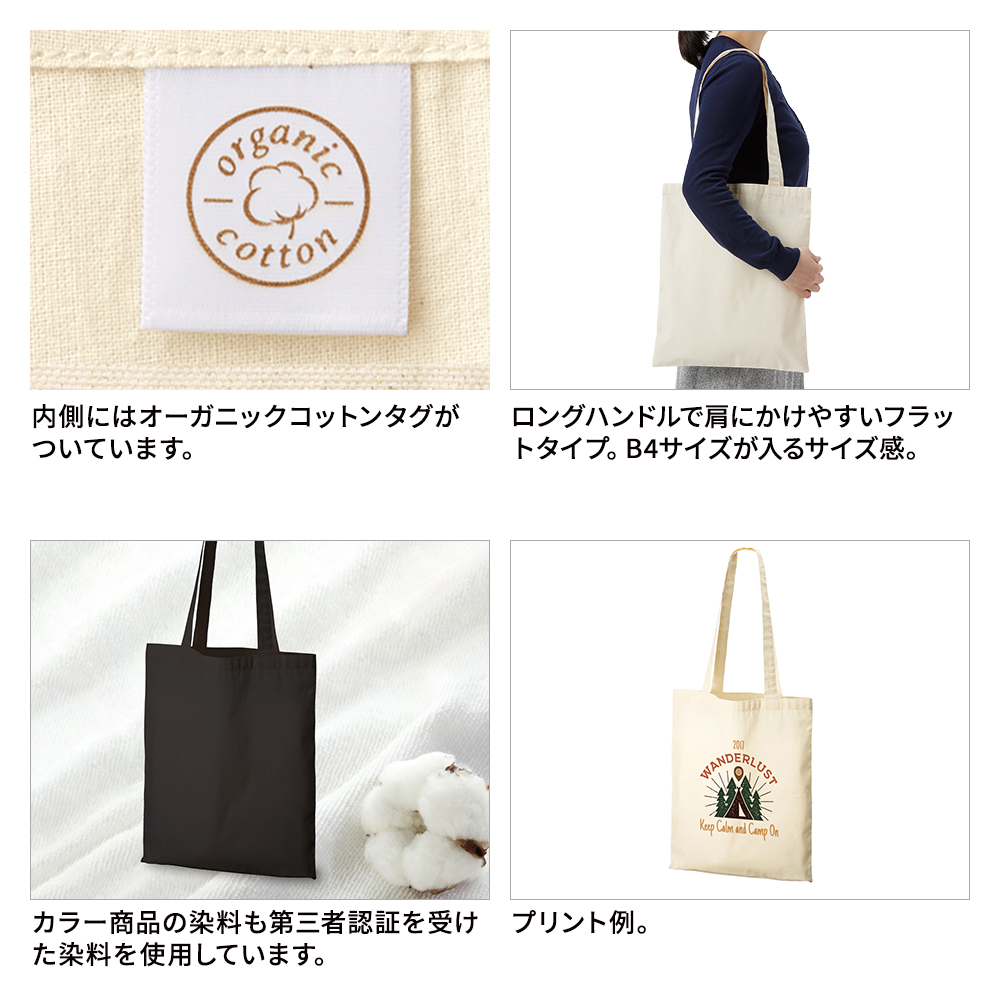 オーガニックコットンを100%使用した、持ち手が長い肩掛けタイプのフラットトートバッグです。