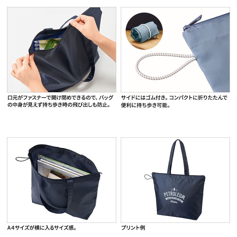 独自の厚さでPUコーティングを施しているため、しなやか且つ耐久性のある生地を使用。A4サイズが横に入るサイズ感なので、サブバッグやエコバッグとして便利です。