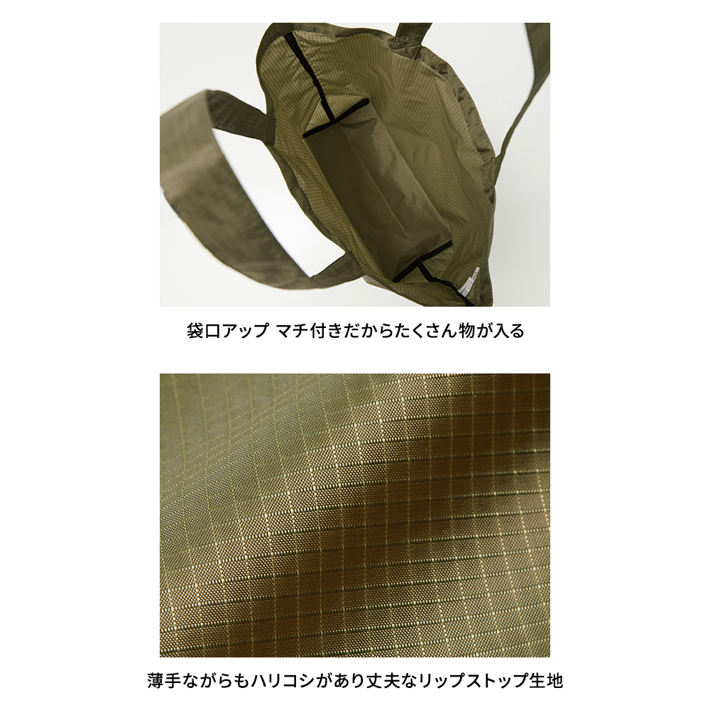 ナイロンのリップストップ生地でつくられた軽量で丈夫なトートバッグ。