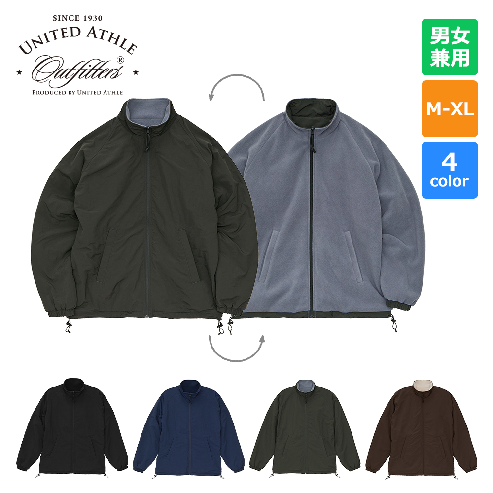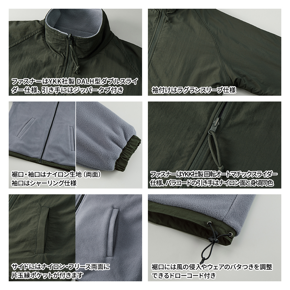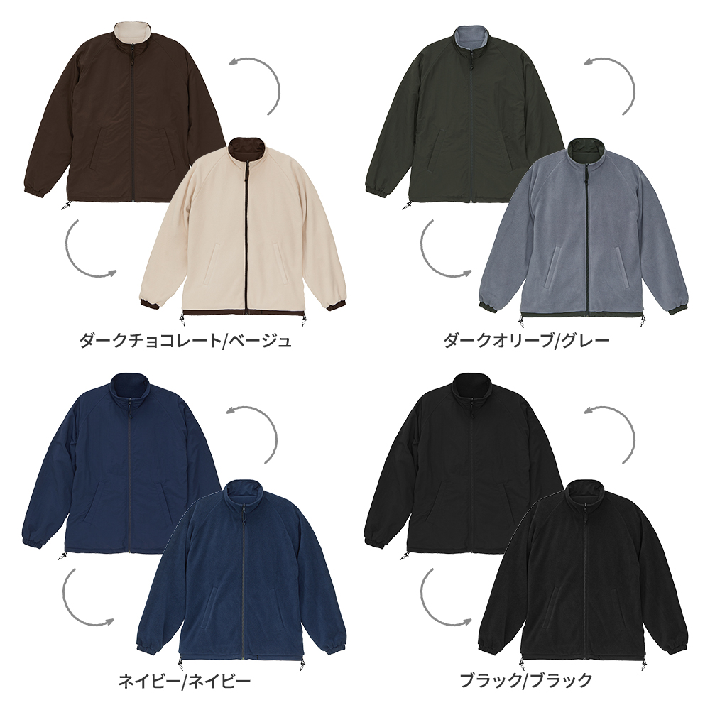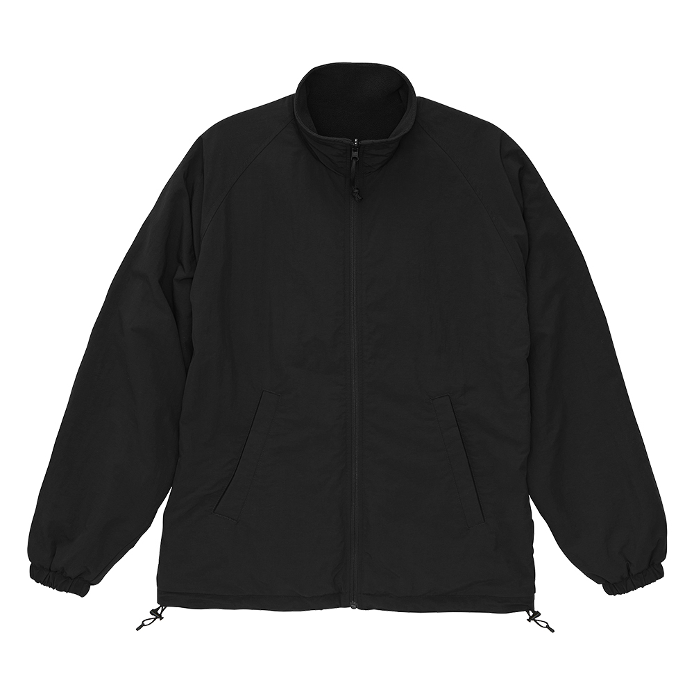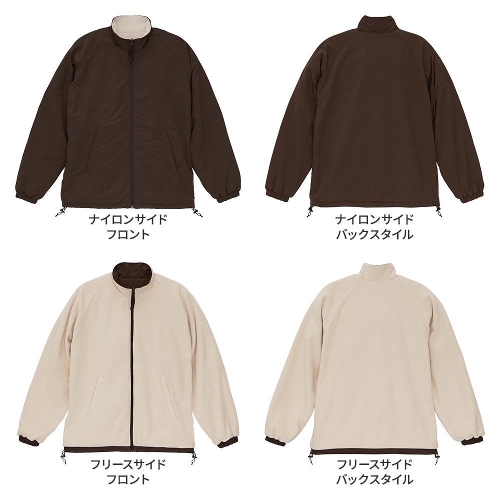 表面がナイロン、裏面がフリースのリバーシブル仕様のスタンドジャケット。 ナイロン側を表にすればシンプルでスポーティーな雰囲気、フリース側を表にすれば、ゴープコアな雰囲気に。 どちらの面もゆったりとしたサイジングで着用できるラグラン仕様。 裾口にはドローコードがあるので、シルエット変化まで楽しめます。 ロントのジッパー部分は両面使えるYKK社製の回転オートマチックスライダーを採用し、目を引くパラコードの引き手がポイント。 シャーリングの袖口は、フリースサイドで着たときに袖口からナイロン部分が覗いてアクセントになるように設計されています。 お好みのスタイルで楽しめるアウターです。 このスタンドジャケットに刺繍やプリント加工をして、オリジナルアウターを作成しませんか。 フリース面の裾部分にはプリント加工に便利なコンシールファスナー付きなので、オリジナルジャケット作成にぴったり! オリジナルブランドのアウター、会社やお店の外用の制服など寒い時期の様々なシーンで活躍します。