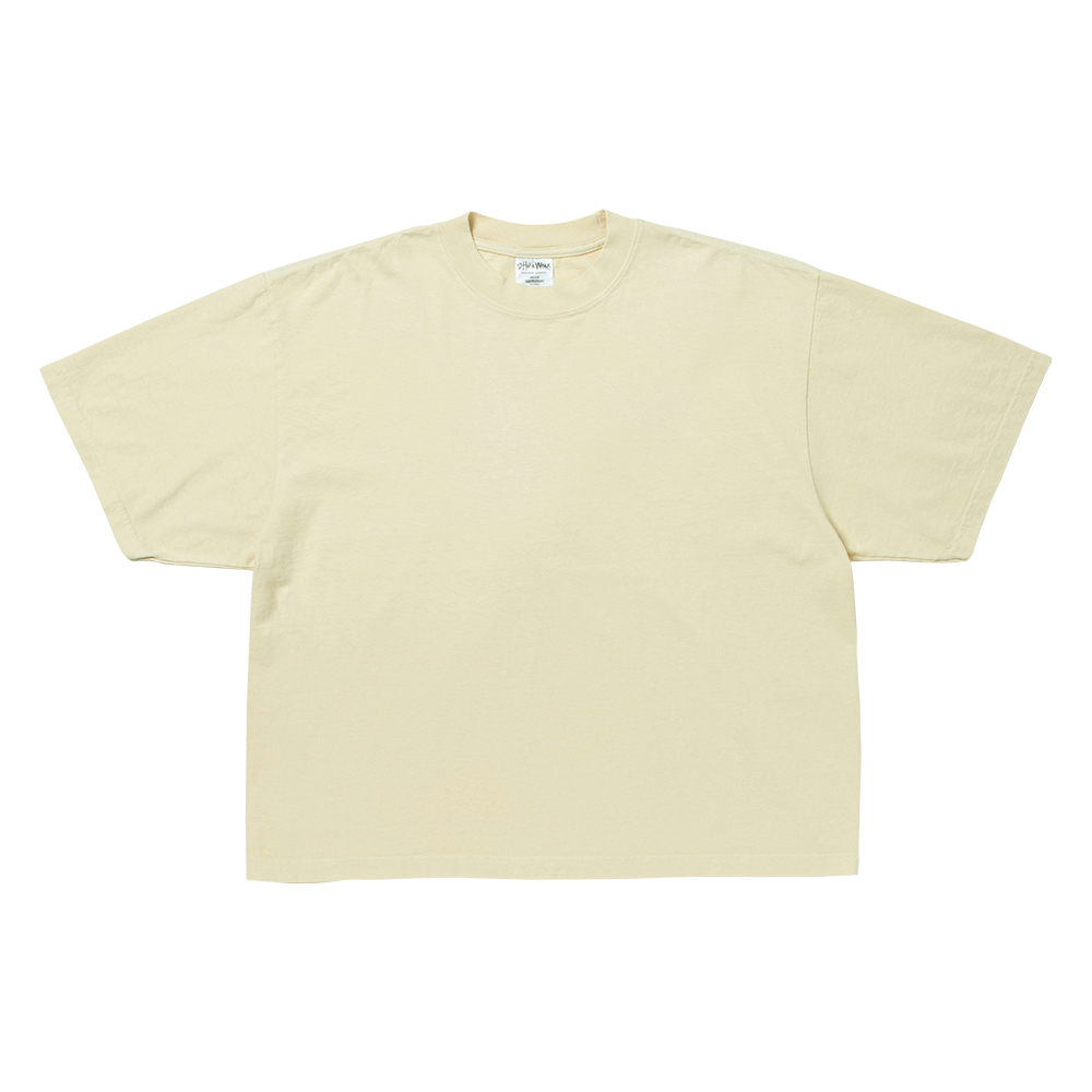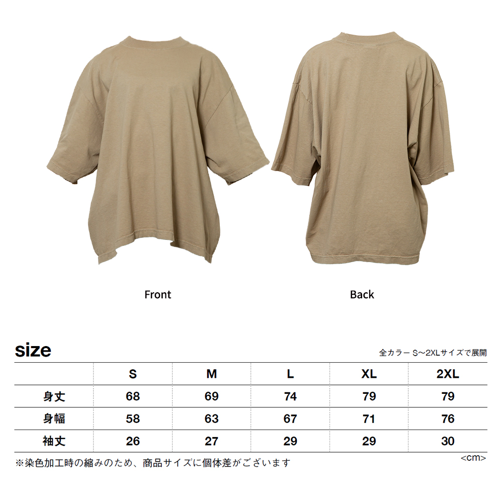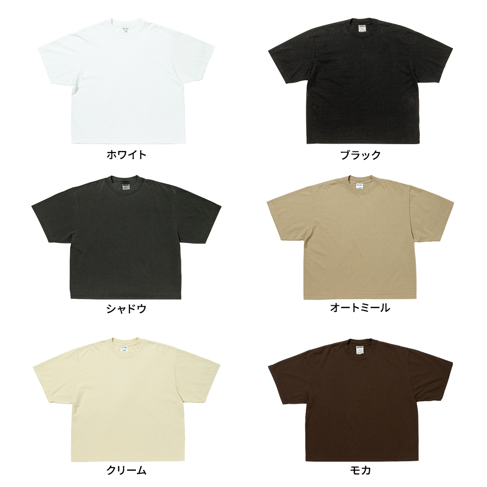 特徴:丸胴タイプ、襟ダブルステッチ、ドロップショルダー、ボックスシルエット、Pre-Shrunk(防縮加工)、サテンラベル、ピグメント染め(顔料染め)
