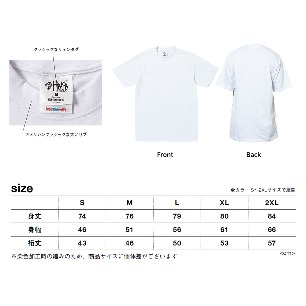 特徴:丸胴タイプ、襟ダブルステッチ、Pre-Shrunk(防縮加工)、サテンラベル