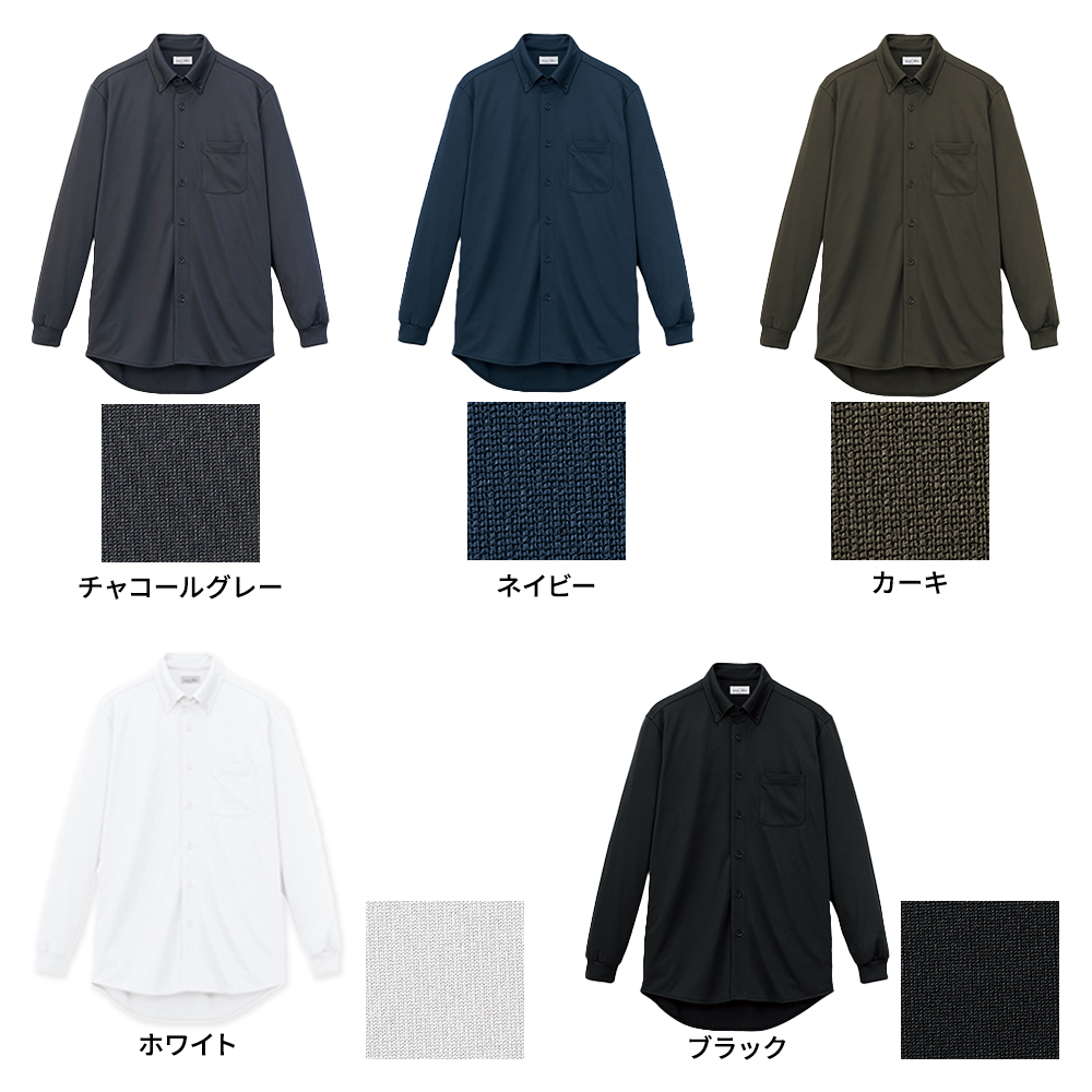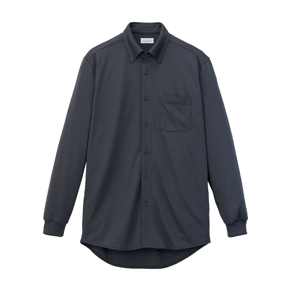 吸水速乾性のあるドライ生地で、シワになりにくく、ストレッチ性があるので動きやすいニット長袖シャツです。また、袖口はリブ仕様になっています。