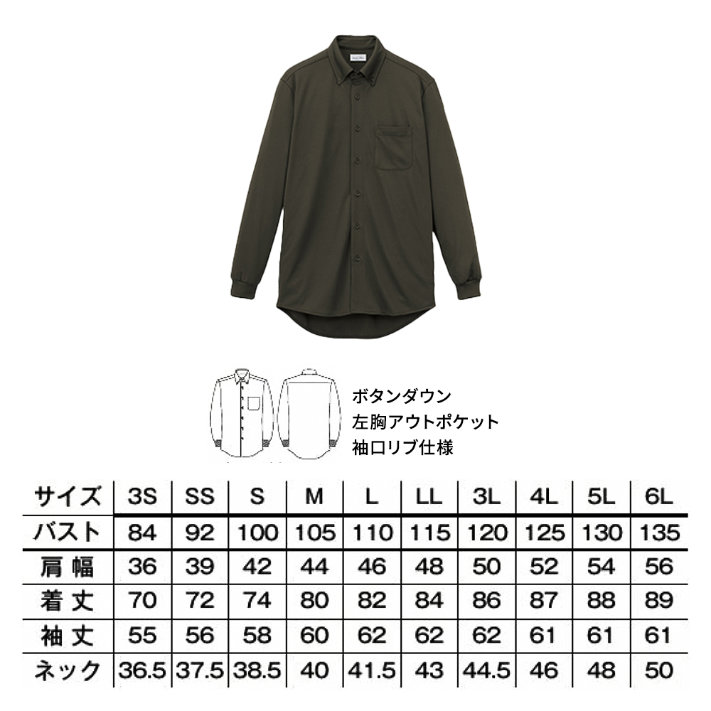 特徴:左胸アウトポケットあり、ボタンダウン、ストレッチ素材、防シワ性、吸水速乾、抗菌防臭加工(ポリジン加工)、UVカット機能、男女兼用